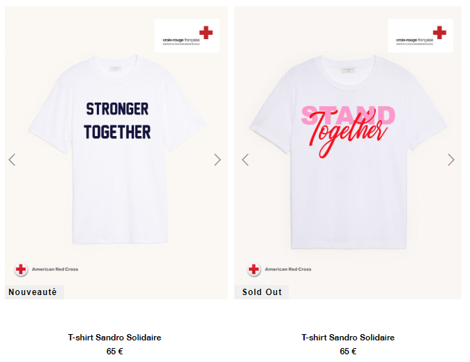 Depuis le mois de mars, les marques se bousculent pour manifester leurs actes de solidarités et de générosités vis à vis de la crise sanitaire sans précèdent qui sévit actuellement. Certains se sont lancé dans la confection et le don de masques et protections pour les soignants. Tandis que d’autres ont proposé des produits en vente afin de récolter des fonds qui seront ensuite reversés à des organismes humanitaires. C’est le cas de Sandro qui a mis en vente des T-shirt pour homme et femme. On trouve l’inscription « Stand Together » et « Stronger Together » sur ces T-shirts. Pour rester connectée à sa communauté, la griffe parisienne a utilisé Instagram pour laisser à ses abonnés le choix du design de ce t-shirt inédit. L’ensemble des bénéfices seront reversés à la Croix-Rouge française.